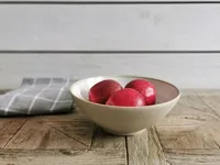 Large bowl with white glazed inside and outside left unglazed to get a nice contrast to the light clay. Suitable for fruit as well as salad.